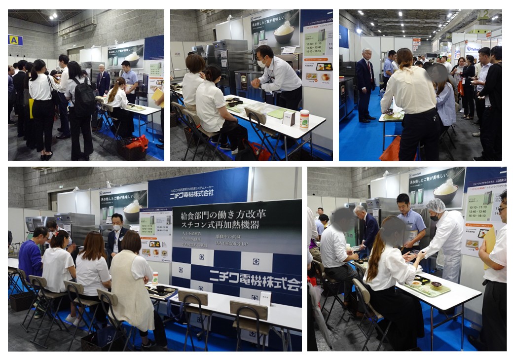 ニュークックチルの試食コーナーでは、ニチワオリジナルの「リヒート松花堂弁当箱」を用いて、ごはん、鮭の塩焼き・金平ごぼう・卵焼きのほか、うどん・パン・ソフト食もご試食いただき、スチコン式再加熱機器による仕上がりを、多くのご来場者様にご体感いただきました。