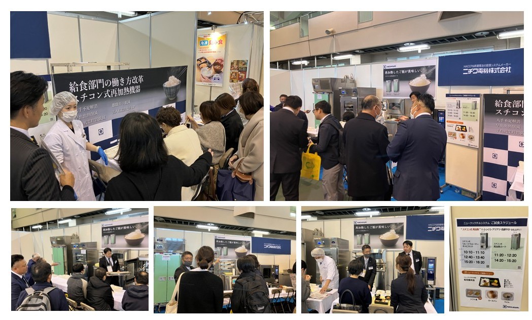 ニュークックチルの試食コーナーでは、ニチワオリジナルの「リヒート松花堂弁当箱」を用いて、ごはん、鮭の塩焼き・金平ごぼう・卵焼きのほか、うどん・パン・ソフト食もご試食いただき、スチコン方式(熱風+蒸気循環方式)による仕上がりを、多くのご来場者様にご体感いただきました。